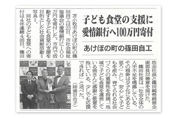 2025年1月21日にこども食堂への支援を目的とした地域貢献活動として、苫小牧市社会福祉協議会の愛情銀行に100万円の寄附を行いました。また、その活動内容が2月3日発行の苫小牧民報に掲載されました。