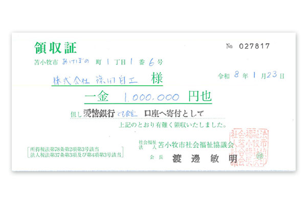 2026年1月23日にこども食堂への支援を目的とした地域貢献活動として、苫小牧市社会福祉協議会の愛情銀行に100万円の寄附を行い、市内12箇所の子ども食堂に寄付金が届けられました。